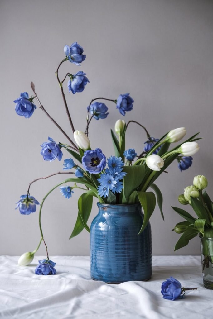 A vibrantly colored vase, particularly one in a striking blue, can be as impactful and eye-catching as the blooms themselves. Pair such a bold vessel with light-toned, simple stems like pristine white paperwhites, delicate white tulips, or soft, understated greenery.