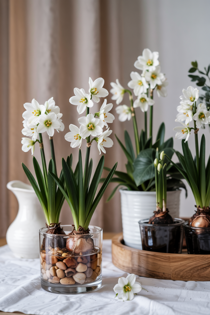 For a living display, plant paperwhite bulbs on a bed of pebbles with a little water and enjoy watching them sprout and flourish, bringing life and greenery to your indoors.