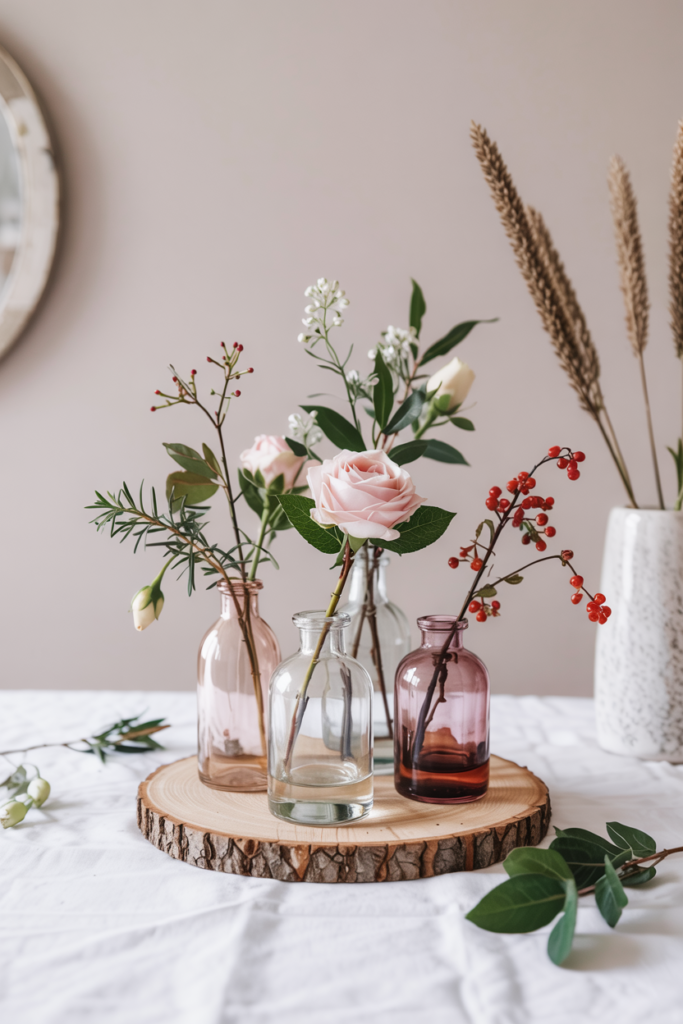 Place just one to three carefully selected stems in each—perhaps a delicate sprig of eucalyptus, a single rosebud, or a vibrant berry branch.