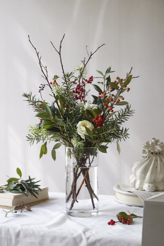 For an instantly impactful yet remarkably effortless display, incorporate branches heavily laden with winter berries. Varieties like buckthorn, holly, or even hypericum berries add dramatic height, rich color, and a delightful rustic texture to any arrangement.