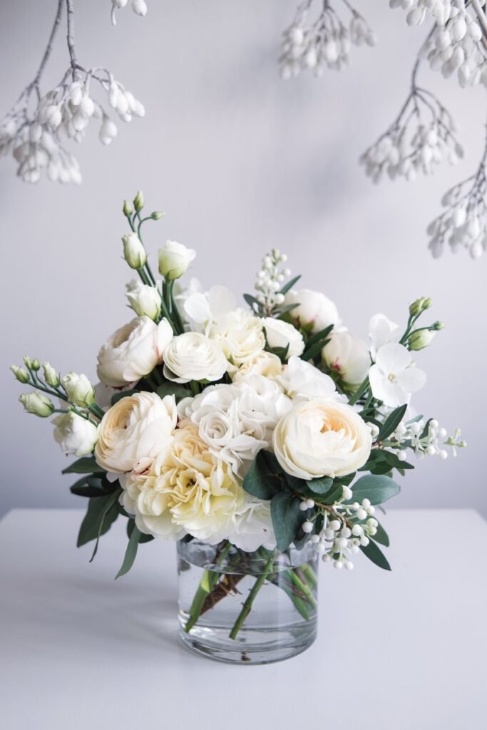 For a more structured and professional look, use a water-soaked block of florist foam in your vase to hold each stem perfectly in place. This arrangement is perfect for any table or mantle, offering a wintery charm.