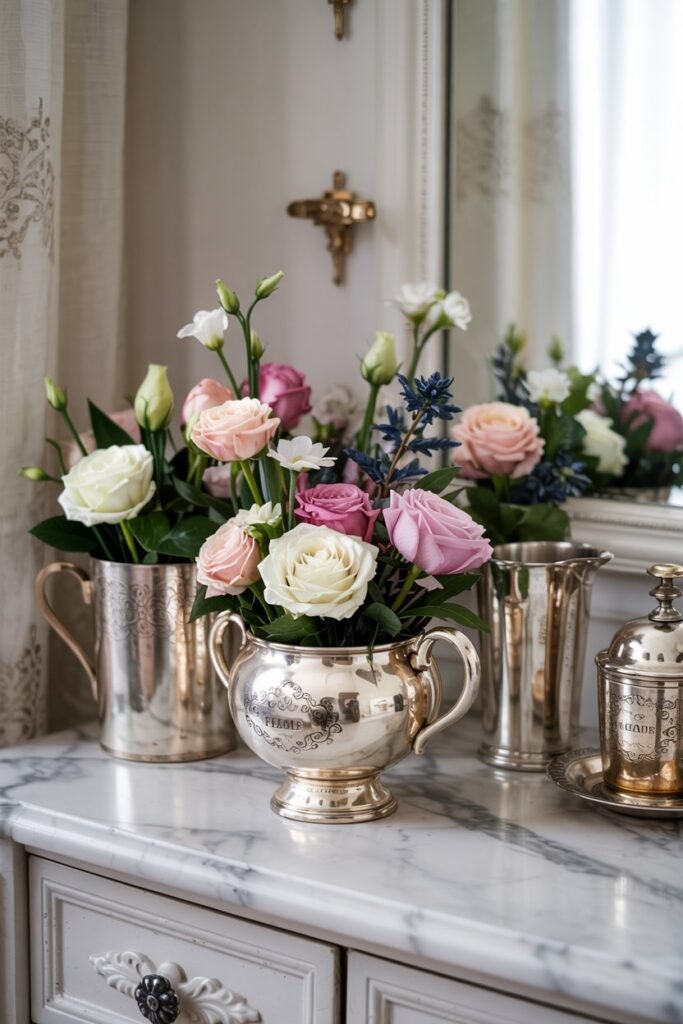 Inject a touch of timeless nostalgia and refined elegance into your floral decor by utilizing heirloom silver pieces as unconventional vases.