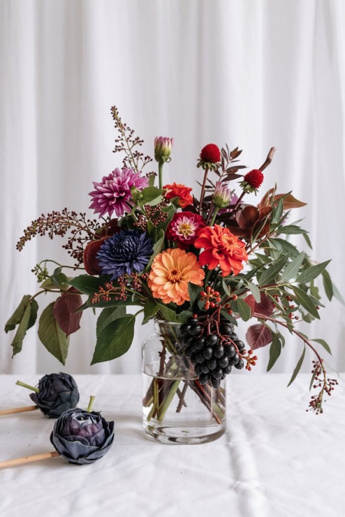 For a centerpiece that truly stands out, embrace the deep, rich colors of winter. Pair dark purple and red dahlias, zinnias, and coneflowers with foraged leaves for added height and drama.