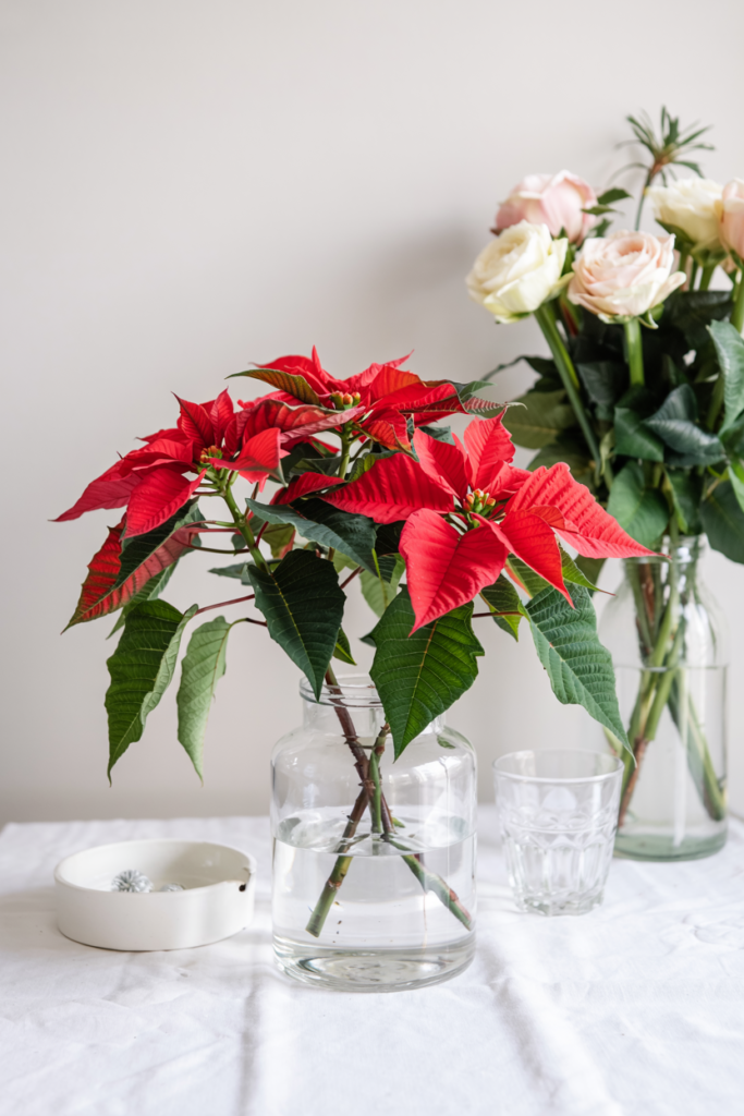 Give your holiday poinsettias a new life after the festive season ends. Instead of discarding them, snip a few of the colorful bracts (the “flowers”) and arrange them in a vase.