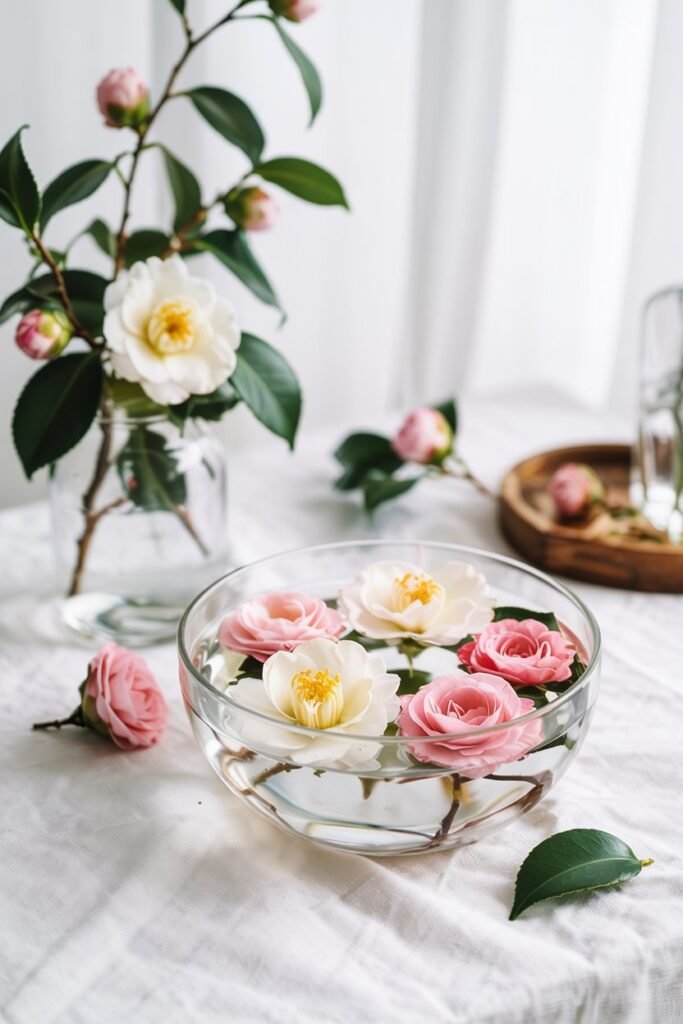 There’s something magical about floating flowers. If you have camellia bushes, snip the blooms just below the heads, leaving a small portion of the stem. Float them in a shallow bowl of water for a delicate, ethereal display.