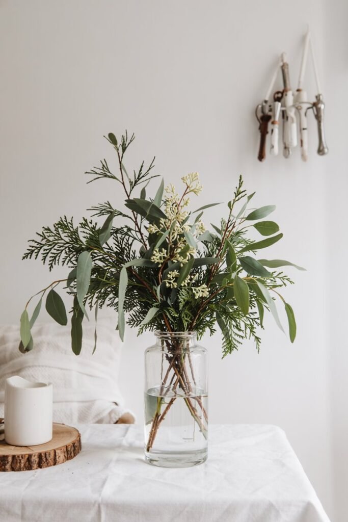 Sometimes, the most stunning arrangements don’t require flowers at all. Evergreen branches like eucalyptus, cedar, and pine can create a simple yet striking display.