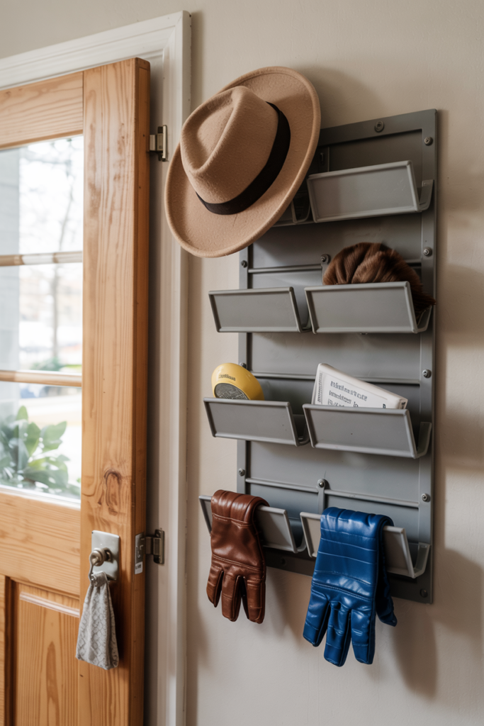 A mail organizer with slots and hooks can be repurposed for winter accessories. The slots are ideal for holding folded gloves, while the hooks can be used for hats.