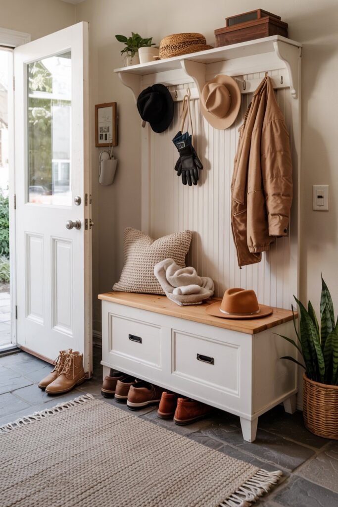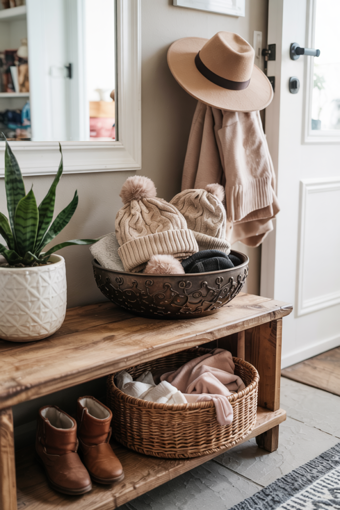 A storage bench by the front door is a game-changer. It provides a place to sit while you put on your shoes and offers hidden storage for all your winter accessories.
