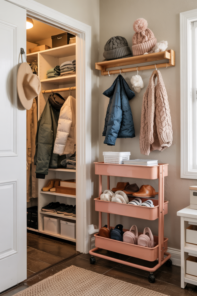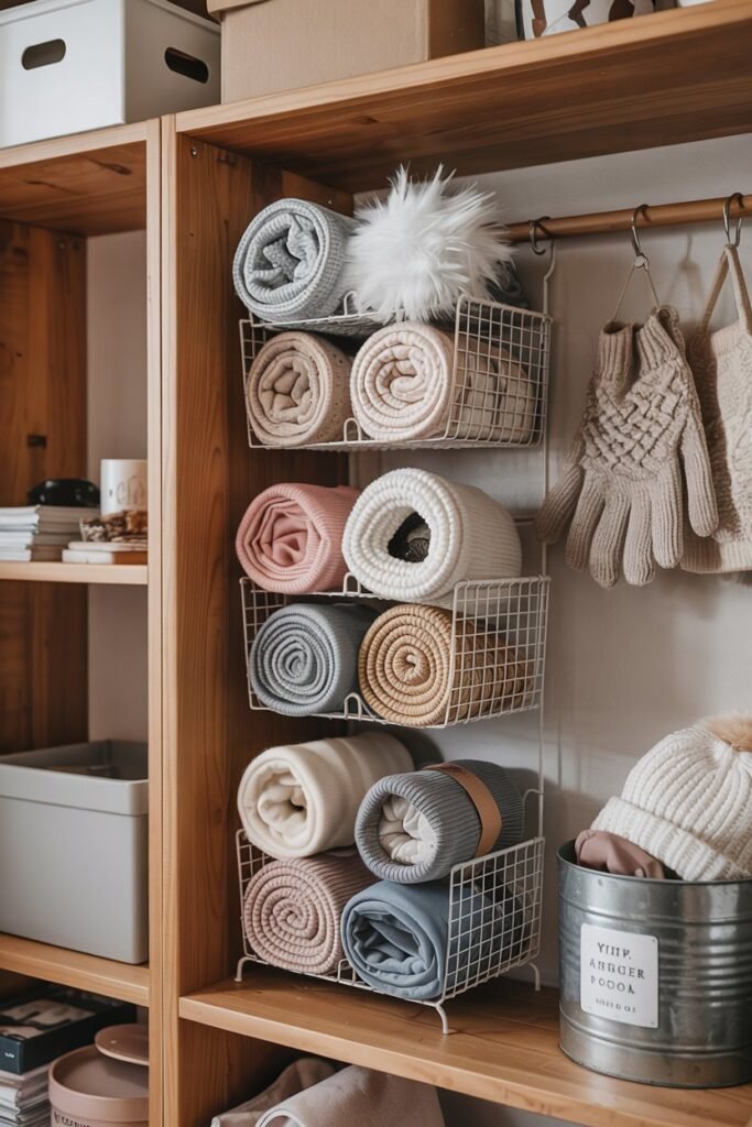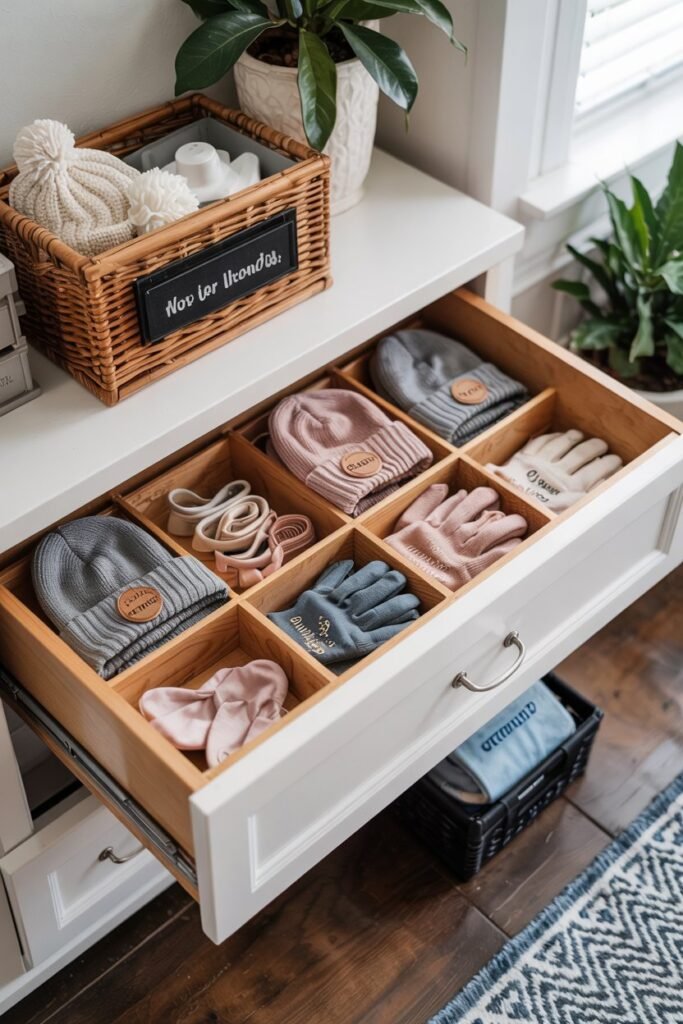 This simple trick transforms a junk drawer into a perfectly organized space. You can roll up your hats and place gloves in pairs, making your morning routine much smoother.