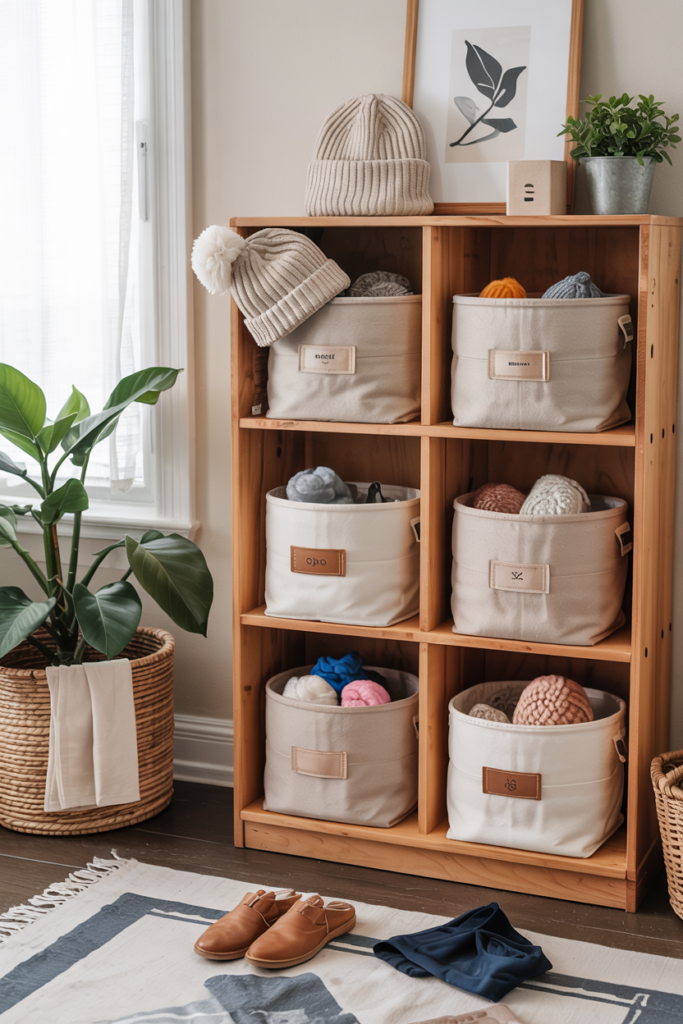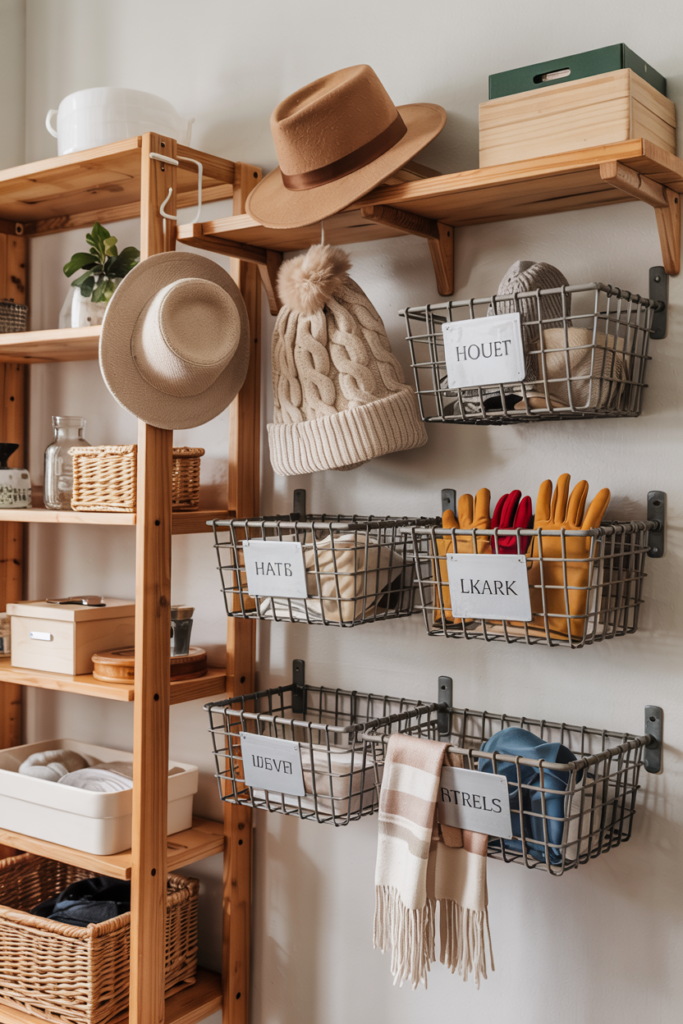 I label each basket for hats, gloves, and scarves to keep things extra organized. The open design also helps damp items dry out faster.