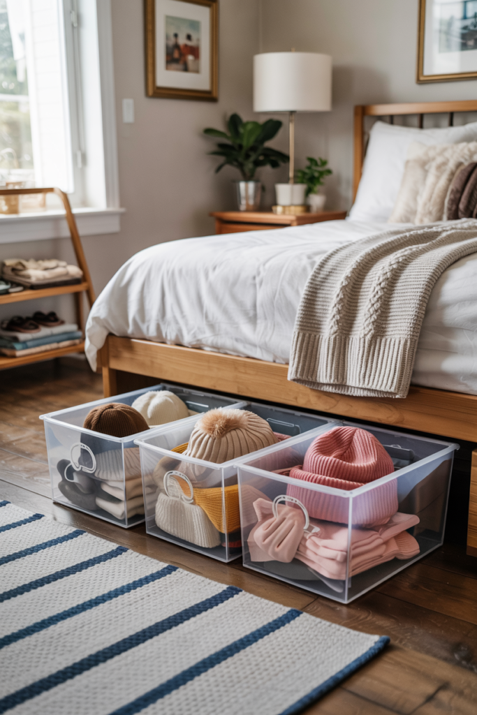 The space under your bed is prime real estate for seasonal storage. I use shallow, clear containers to store my winter hats and gloves during the warmer months.