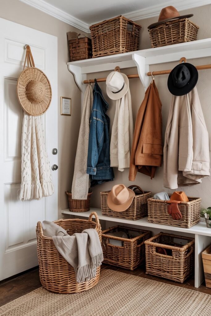 You can also use smaller baskets on a shelf in your mudroom or closet. They hide the clutter while adding a touch of natural texture to your decor.