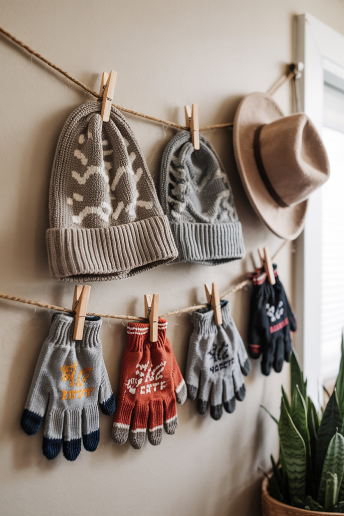 For a simple, rustic solution, I hang a string or a piece of twine across a wall in my mudroom. I use clothespins to clip my gloves in pairs and hang my hats.