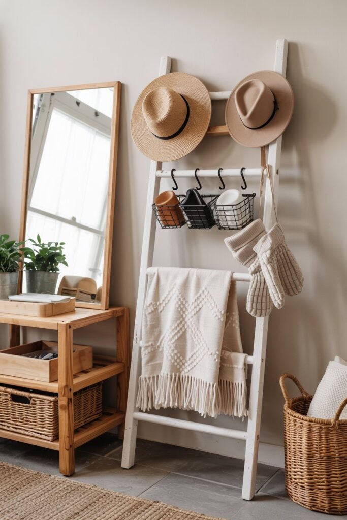 For a trendy, minimalist look, I use a decorative ladder. You can hang hats on the rungs or use S-hooks to hang small baskets for your gloves.