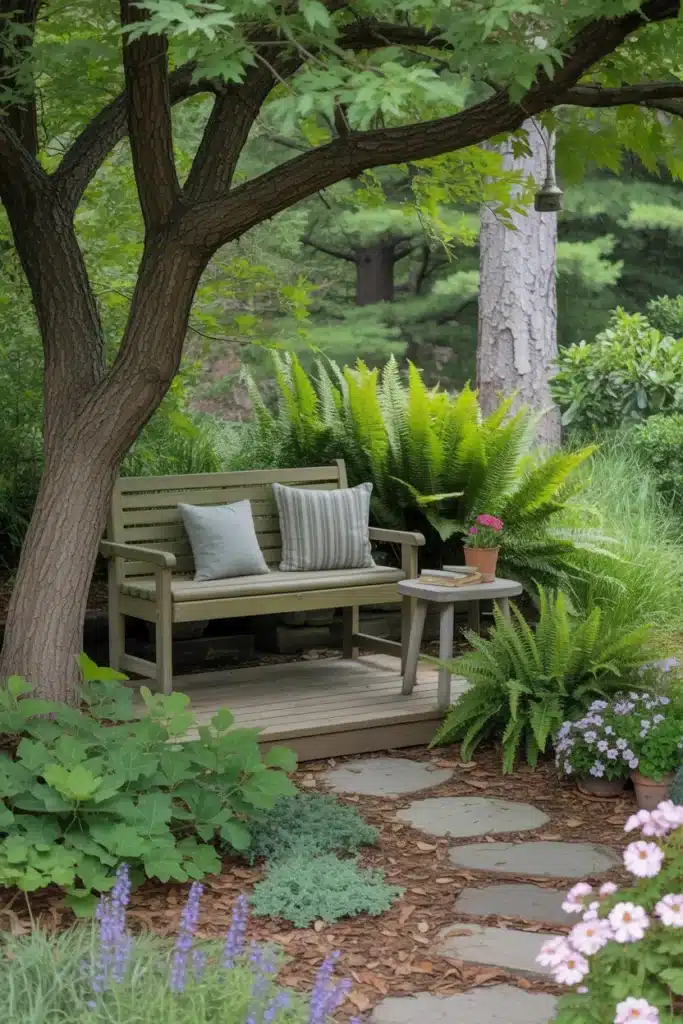 A simple bench surrounded by ferns and flowering perennials creates an inviting retreat. I position these areas to take advantage of filtered light and pleasant views. Adding a small side table makes these spaces more functional for extended use.