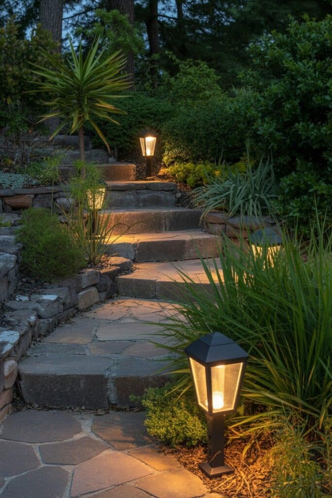 Position lights along pathways and near seating areas for safety and ambiance. I prefer warm-toned lights that don’t disrupt natural night cycles. Simple lantern-style fixtures or ground-level path lights maintain the natural aesthetic while providing necessary illumination.