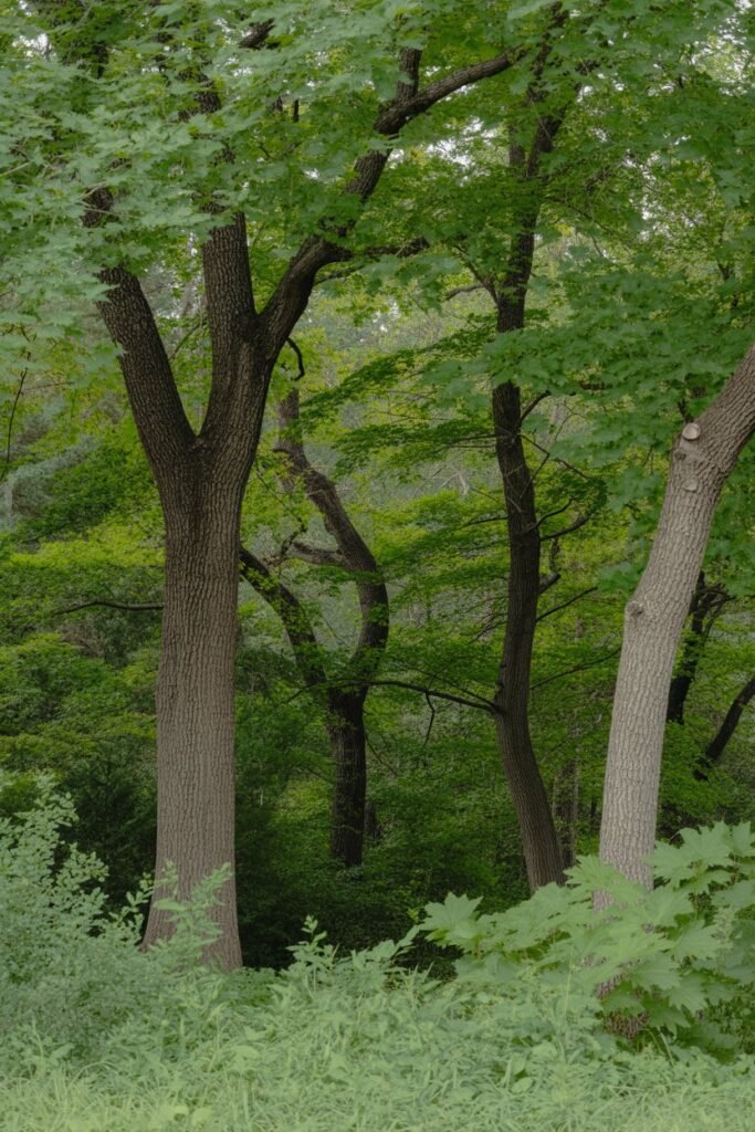 Oak, maple, and hickory trees provide excellent canopy coverage and support local wildlife. These trees also drop leaves that create natural mulch, feeding the soil and supporting the woodland ecosystem. Plant younger trees about 20-30 feet apart to allow for mature growth.